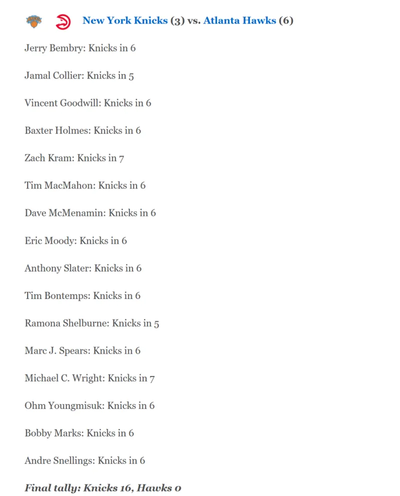 这轮系列赛,我只能说越来越有意思了——ESPN的预测里,16个专家全部选择了尼克斯晋级,现在再看,老鹰真的没有那么好打。