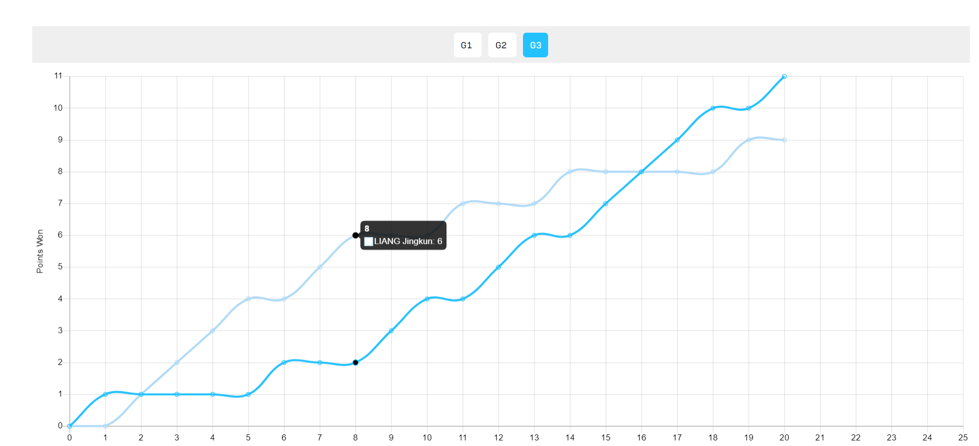 第二局梁靖崑是一败涂地,第三局梁靖崑开局打得不错一度6-2领先4分,可随着比赛的深入大胖的领先在被黄友政蚕食,在8-8时已经被扳平,随后黄友政10-8拿到赛点,最终黄友政完成大逆转。