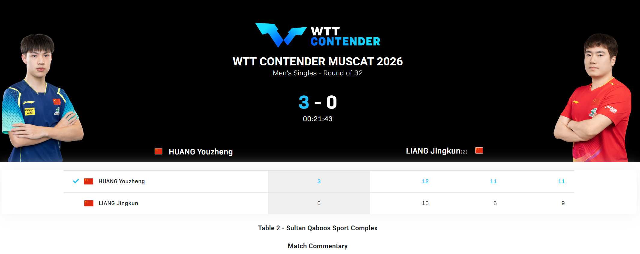 北京时间1月21日晚,WTT马斯喀特常规挑战赛男单1/16决赛,黄友政3-0横扫梁靖崑,三局比分:【12-10,11-6,11-9】。这场比赛算是国乒新星将国乒主力吊打的一场,29岁的梁靖崑再一次颜面扫地。
